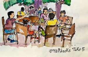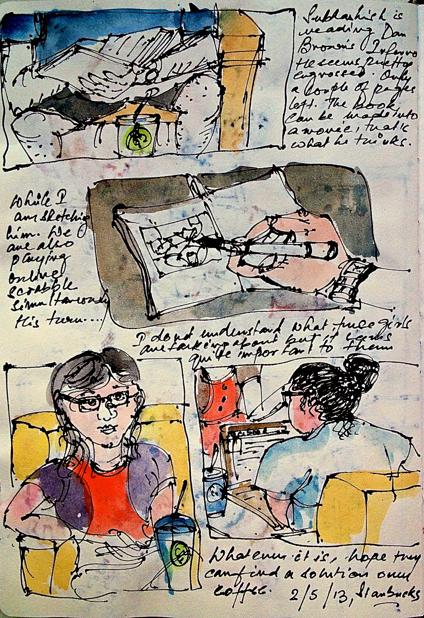 I have honed my seat grabbing skills over three years of Starbucks patronage at my neighbouring outlet where I’ve worked, planned vacations, played scrabble, finished several tomes and drank gallons of coffee and tea. And only recently, have I started sketching and it isn’t surprising that in my 90 page sketchbook, which I finished recently, there are more than twenty sketches done at this location of the same individuals, groups and clusters I talk about. I observed them only because I sketched them.