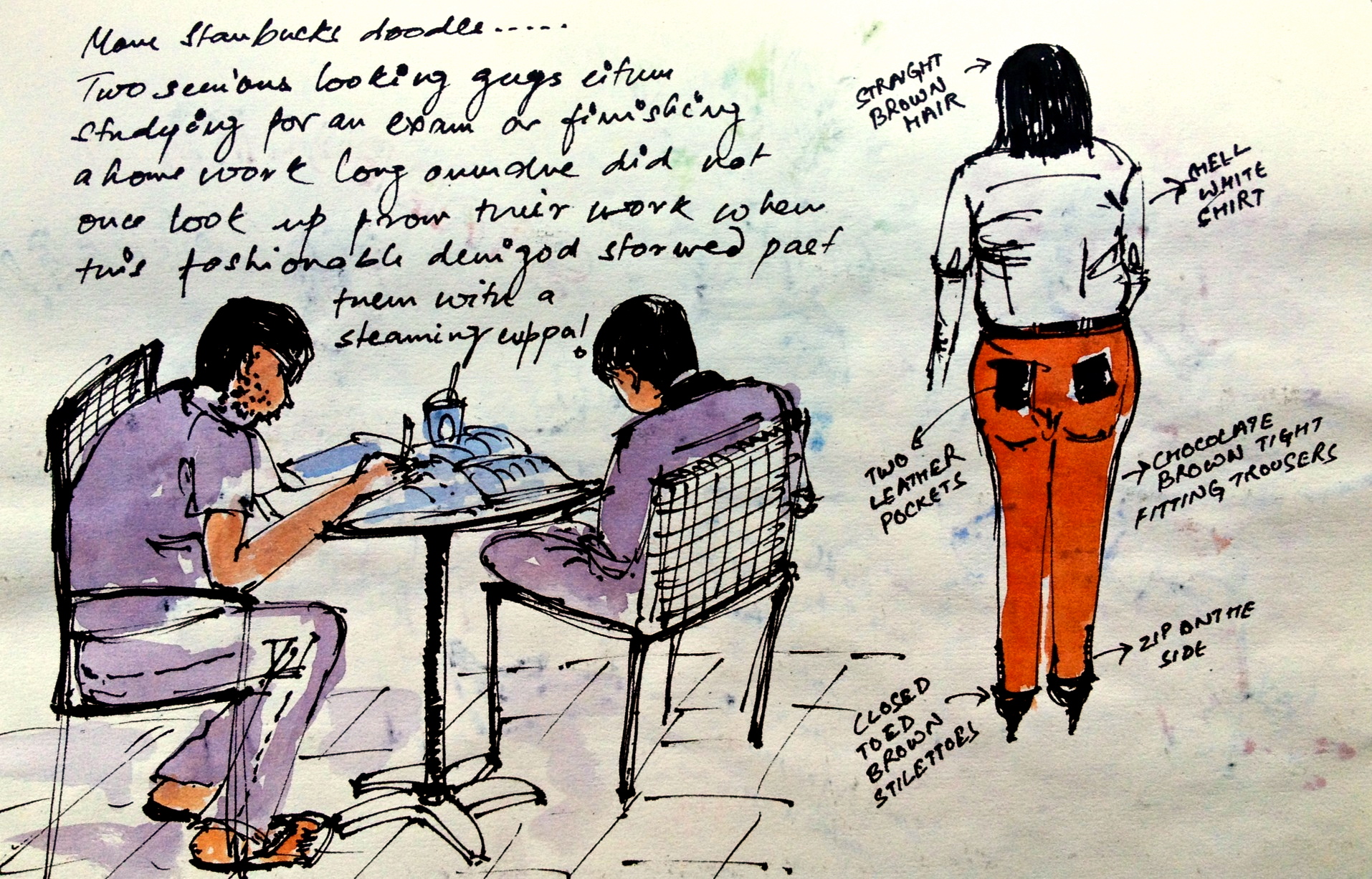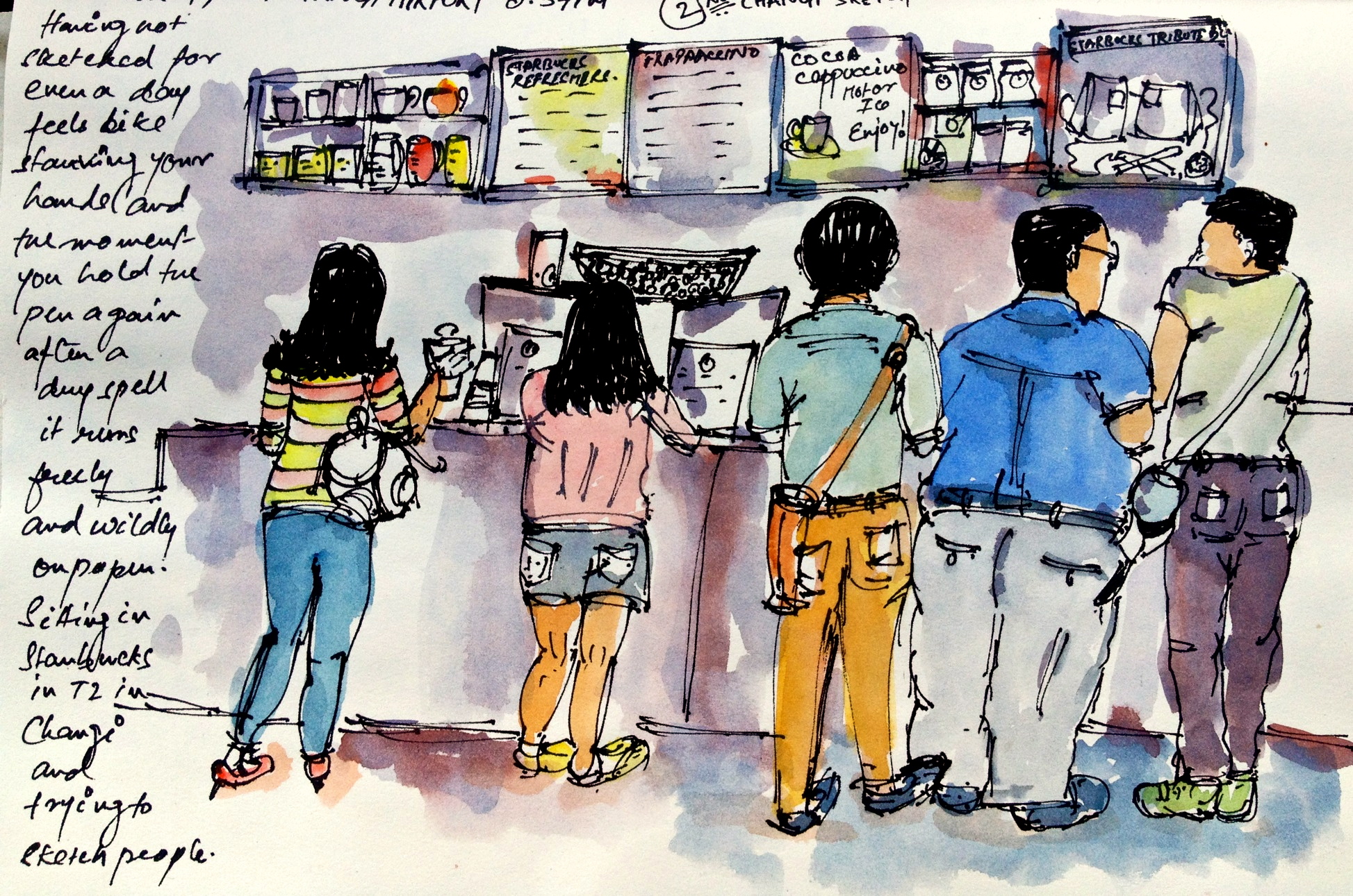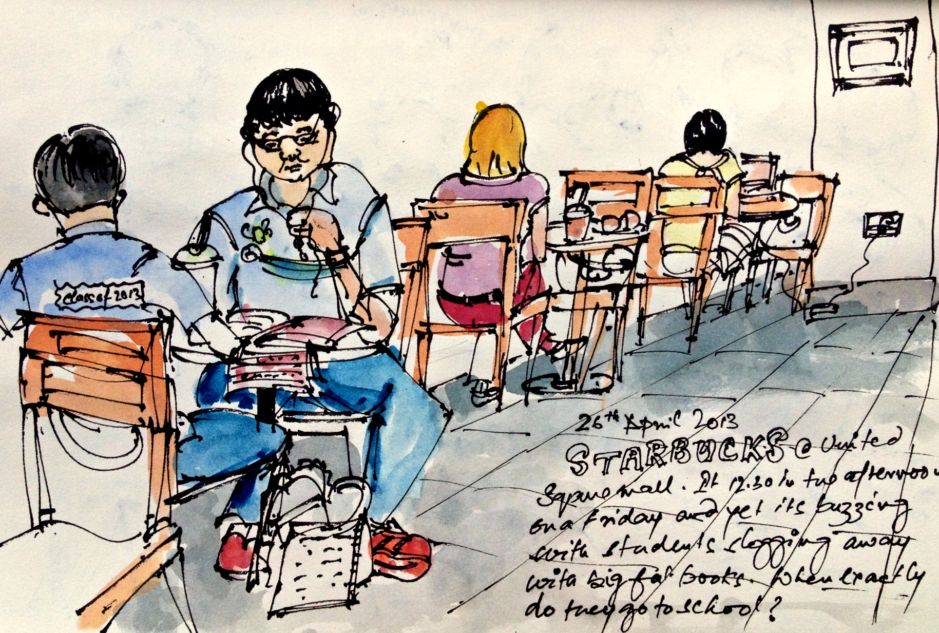 All sorts of students, specially pimply restless school students plugged in to their music sipping frothy matcha latte are common sight at the local Starbucks and always make great subjects for drawing.