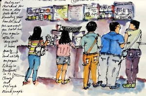These people captured in my sketchbook can be generically labelled as say, the coffee drinkers of Singapore because that’s what they’re technically there for but that’s not the only thing they do or if you’re observant enough, that’s not the only thing you see them doing. I once sketched a chain-smoker with a lot of swagger sipping coffee and blowing smoke into the ‘No smoking ‘ sign right next to him.