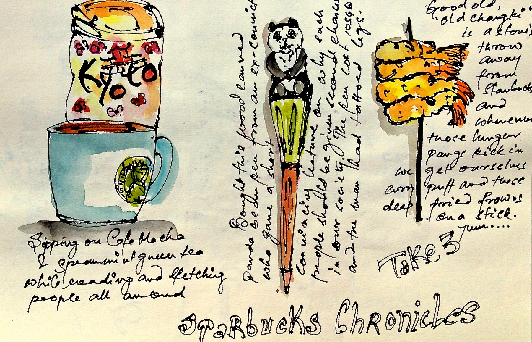 Any sketch when looked at several days or months later, evokes the moment, in its tiniest details.  Like this hand carved wooden panda bear pen that was sold to me at the cafe by an ex-convict with heavily tattooed legs.
