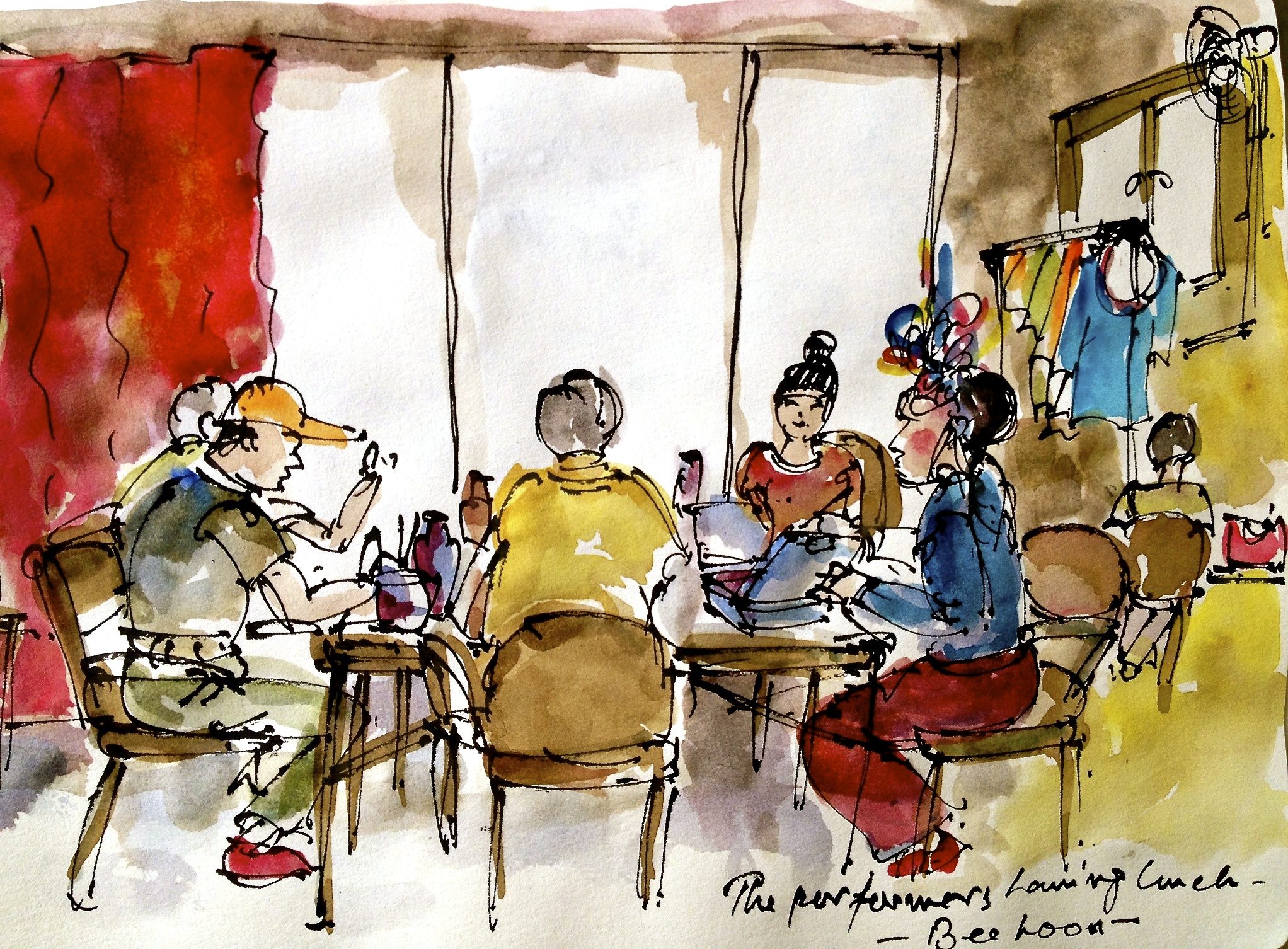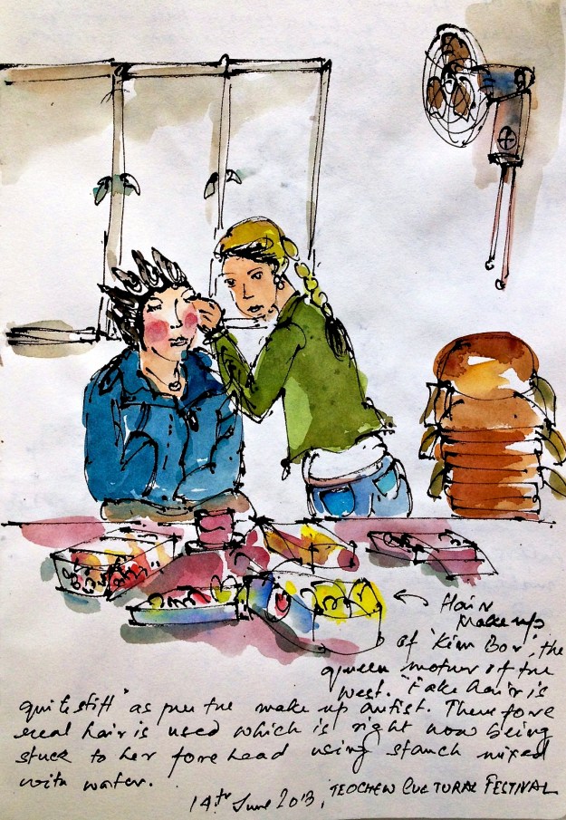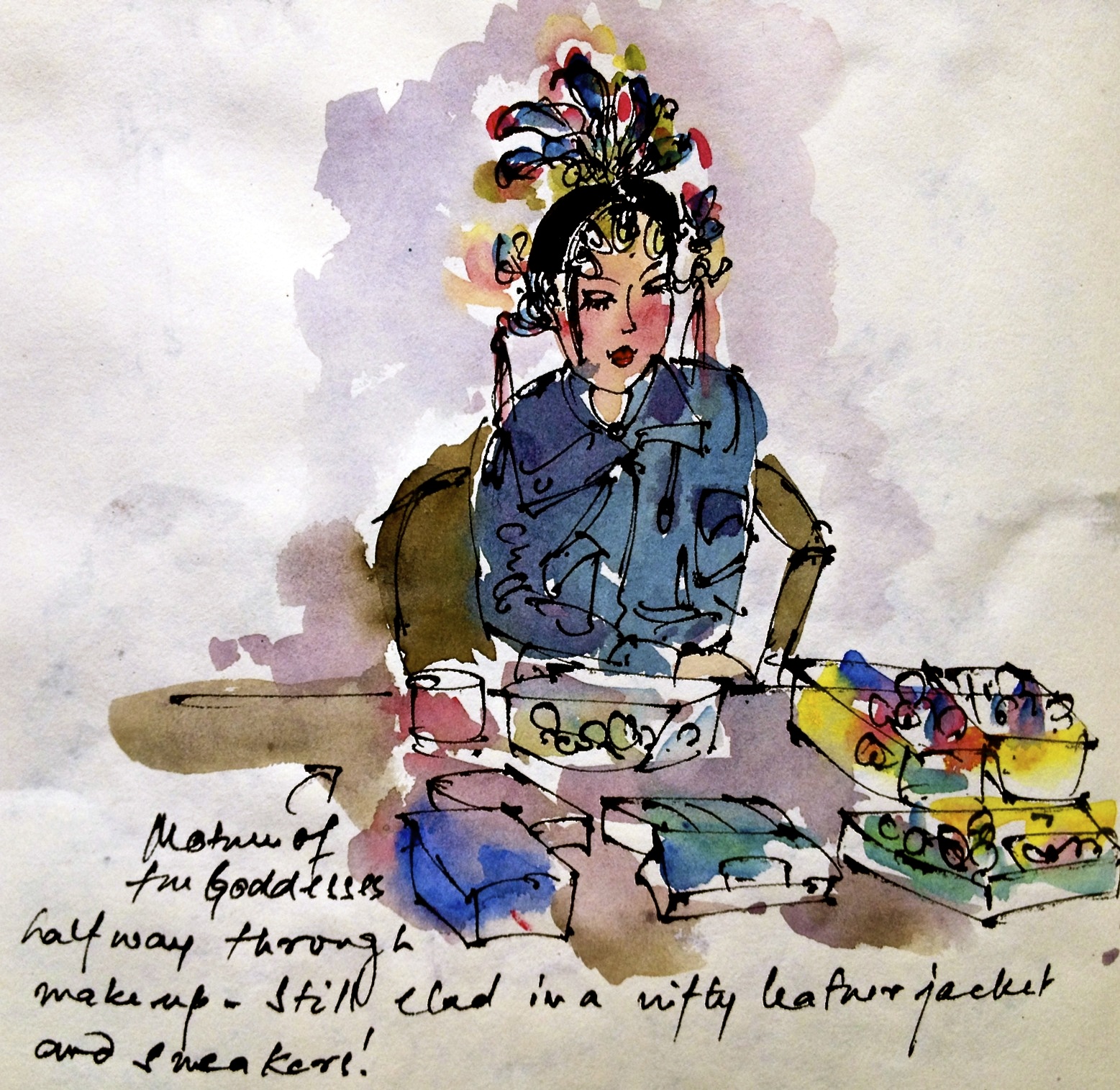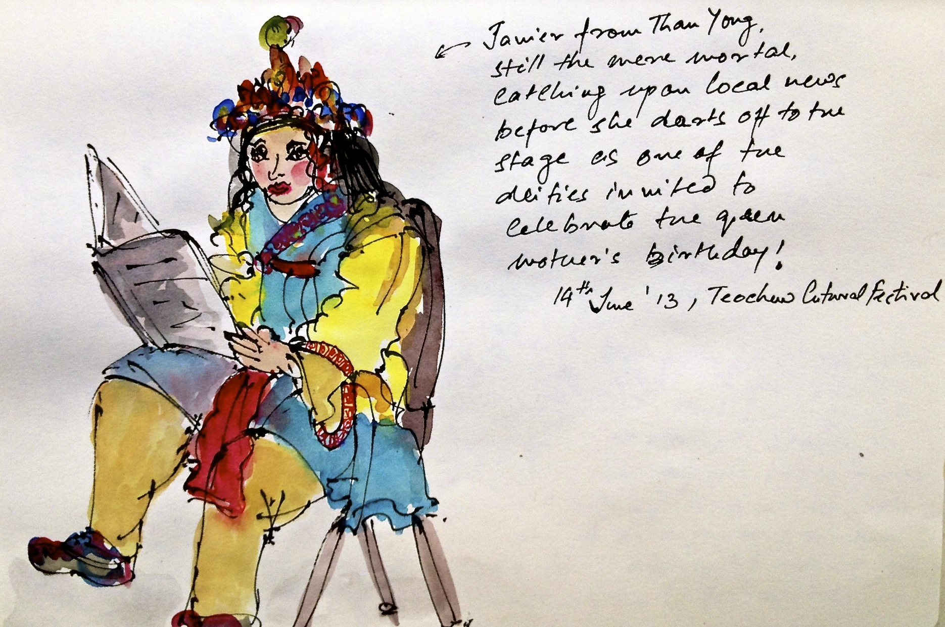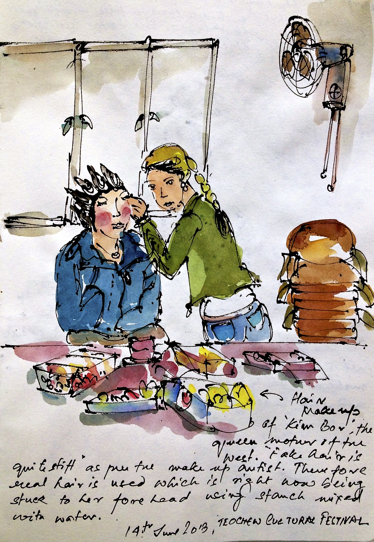 Since 3 in the afternoon, I am at the backstage, observing and recording the hair and make up process of a group of Teochew Opera performers in my sketchbook. In a span of six hours I have watched these 21st century men and women metamorphose bit by bit into ancient Chinese officials, philosophers, scholars, lovers, courtesans and further back in time, into celestial beings such as deities of wealth, success, longevity and such.