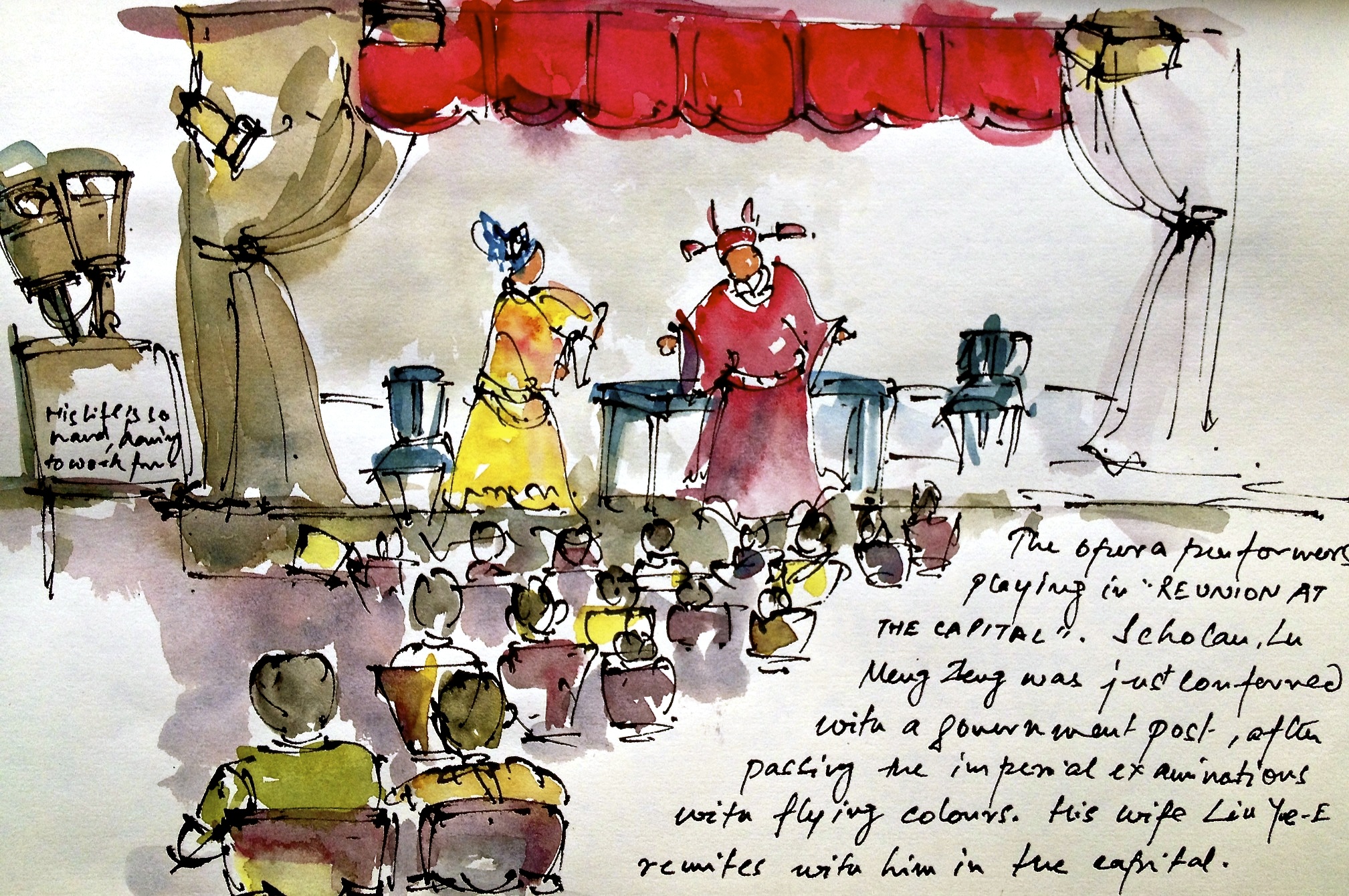 My sketch reportage of many such events I’d been invited to, though disparate – like recording the make-up session of a Teochew opera group, or trying my hand at wrapping rice dumplings at a Taoist temple, or drinking coffee at a shophouse kopitiam or visiting a heritage Peranakan house and so on – have brought me closer to understanding the country I live in. And what more, the equation is symbiotic – while the invitee gets an interesting premise to sketch and talk about,  the inviter gets to promote a cause or create awareness, which brings me to the courtyard of Thian Hock Keng Temple, on 158 Telok Ayer Street, where I along with other fellow sketchers have gathered upon one such invitation – to sketch and see a Nanyin concert performed on the temple premises only thrice a year by Siong Leng Musical Association.