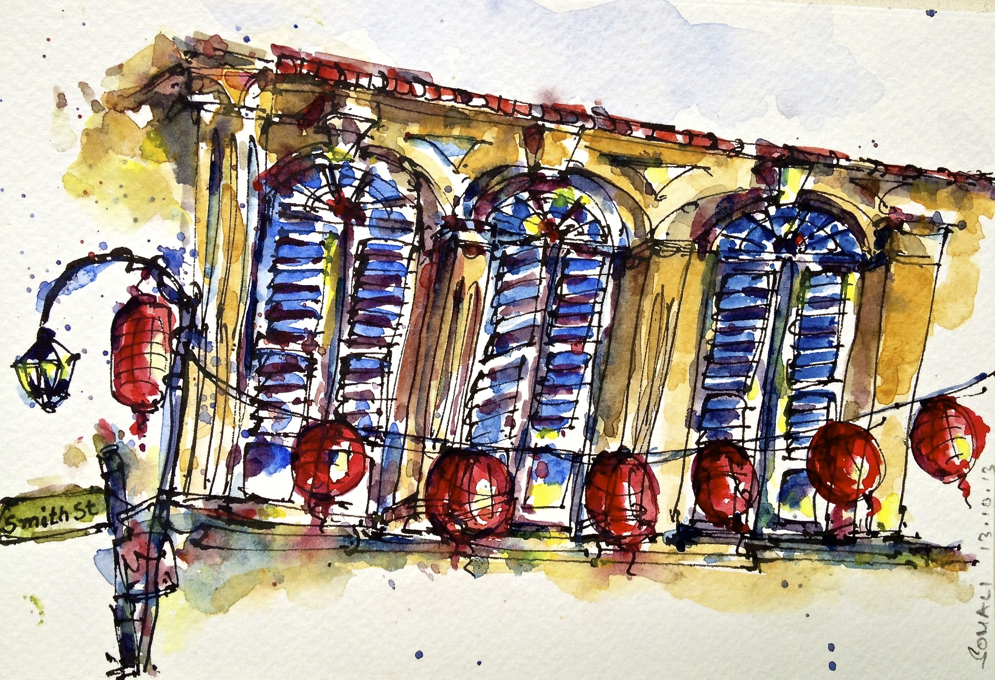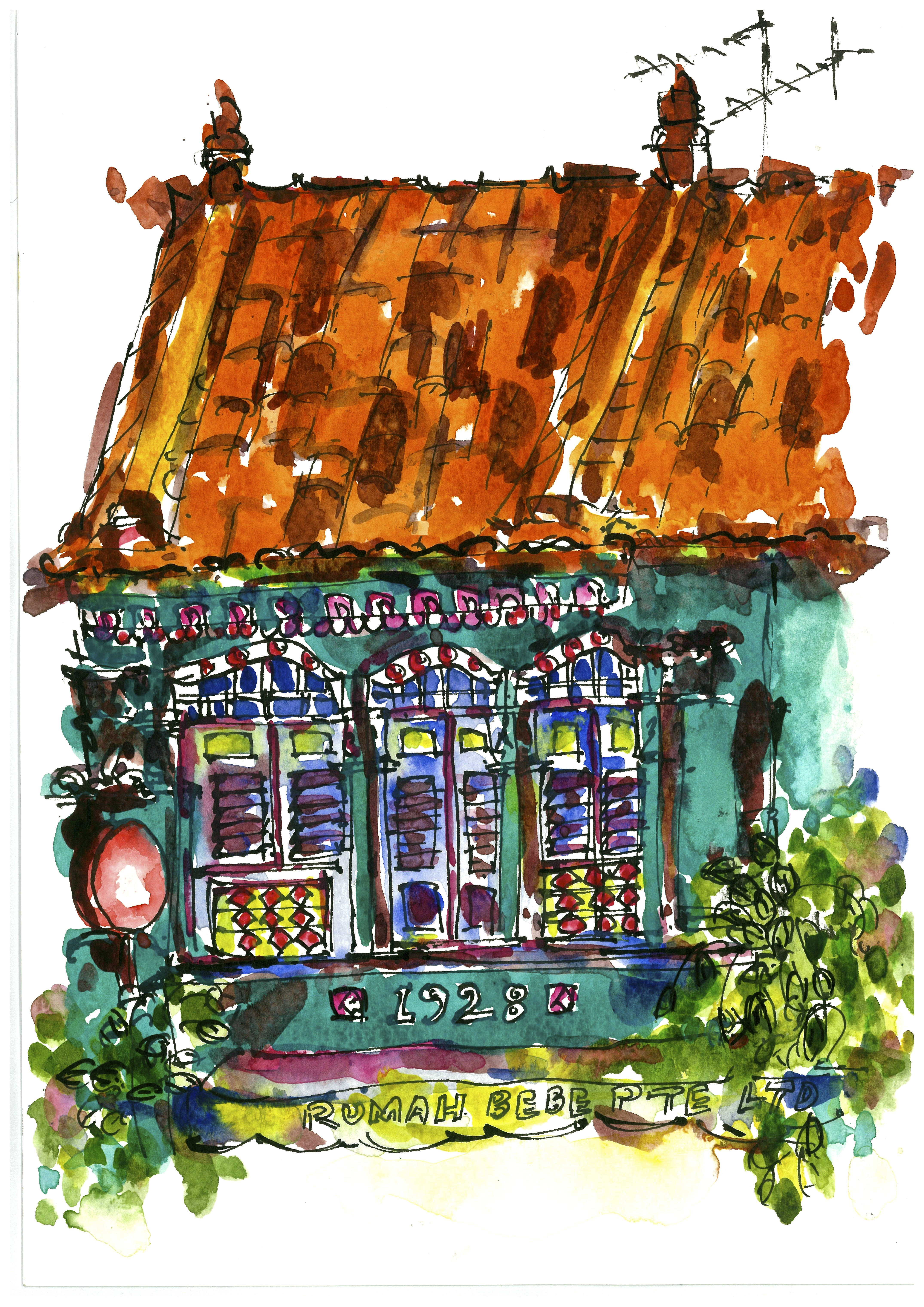 “Bukit is a Malay word for hill and Pasoh stands for Alibaba pots (earthenware pots) “, said our guide. Apparently in 1846, Bukit Pasoh was recorded to be 1281 feet in elevation and was home to many 19th century kilns that produced these pots used in homes to store water and rice. This street was also home to many clan associations (which were basically societies that helped 19th century immigrants from China to settle in Singapore and find their footing) , some of which still survive today and in one such building on 18 Bukit Pasoh Road called Gan Clan Singapore (formerly known as The Gan Clan Association) there’s an art exhibition happening on the 4th floor where one of my sketches is sharing space with many beautiful pieces of work, all based on the theme Da Po – Old and New Chinatown.