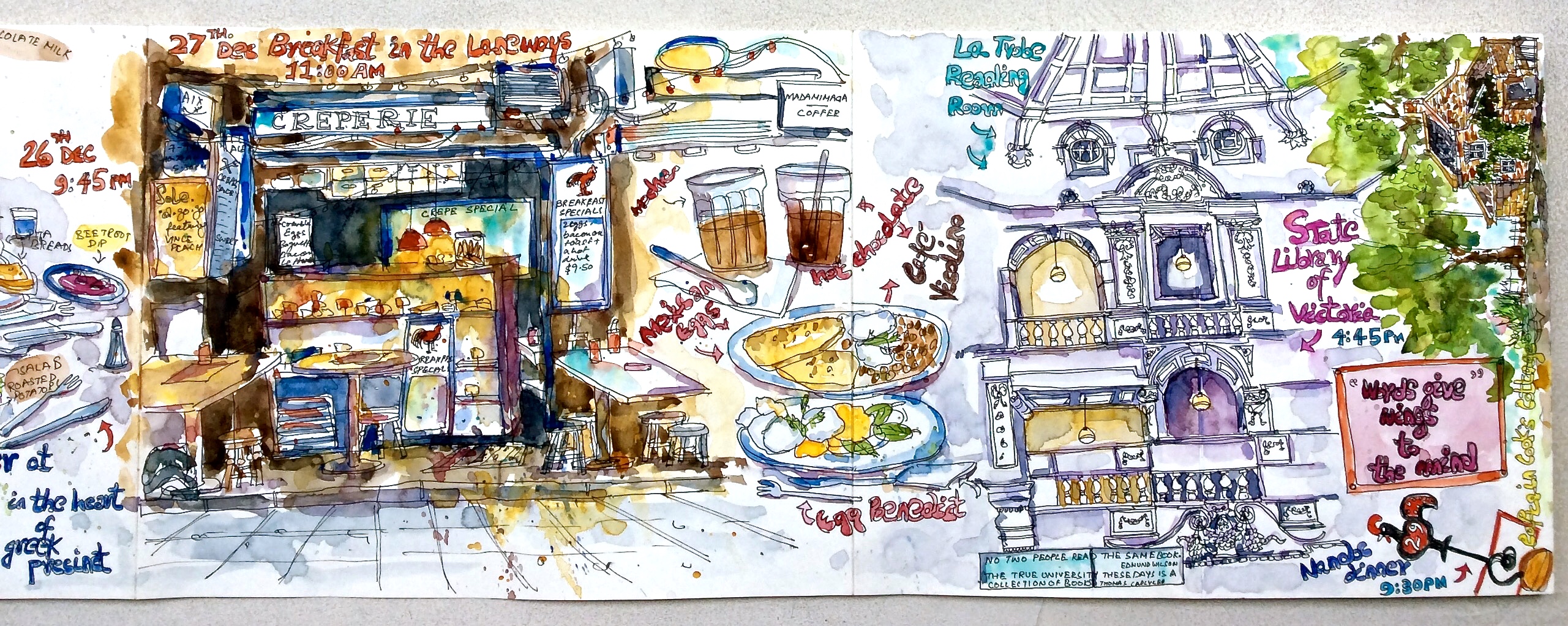 27th Dec / Melbourne : I sketched this cute eatery called ‘Creperie’ while having breakfast at Cafe Vicolino on Degraves Street; a portion of the magnificent La Trobe Reading Room was tackled inside the State Library of Victoria; a tiny Captain Cook’s Cottage in the extreme right was sketched in the late evening under the tall shadows of English Elms.