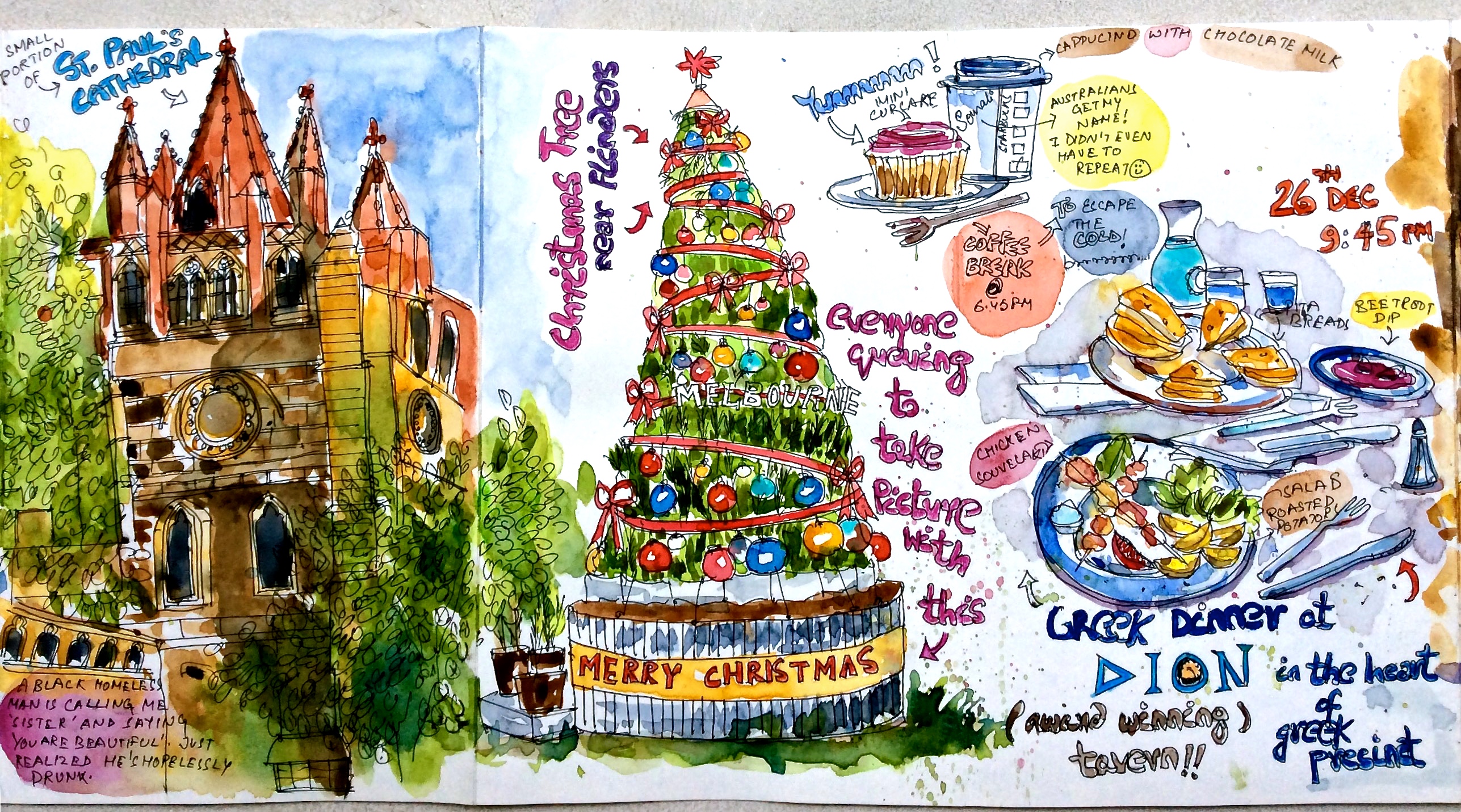 25th Dec + 26th Dec/ Melbourne :  Inflight sketch from from my seat; Hot chocolate and muffin at Starbucks; Rice paper rolls bought on Flinders street consumed at Fed Square with seagulls and people.