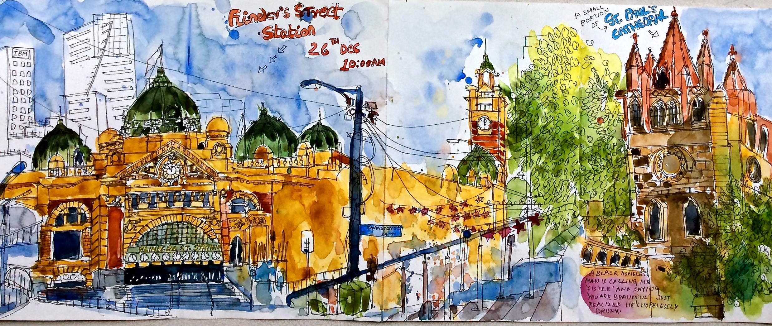 26th Dec / Melbourne : Flinders Station sketched from the steps of St. Paul's Cathedral