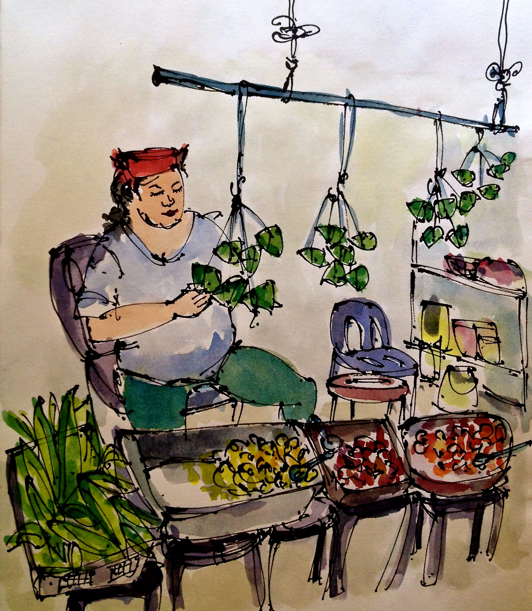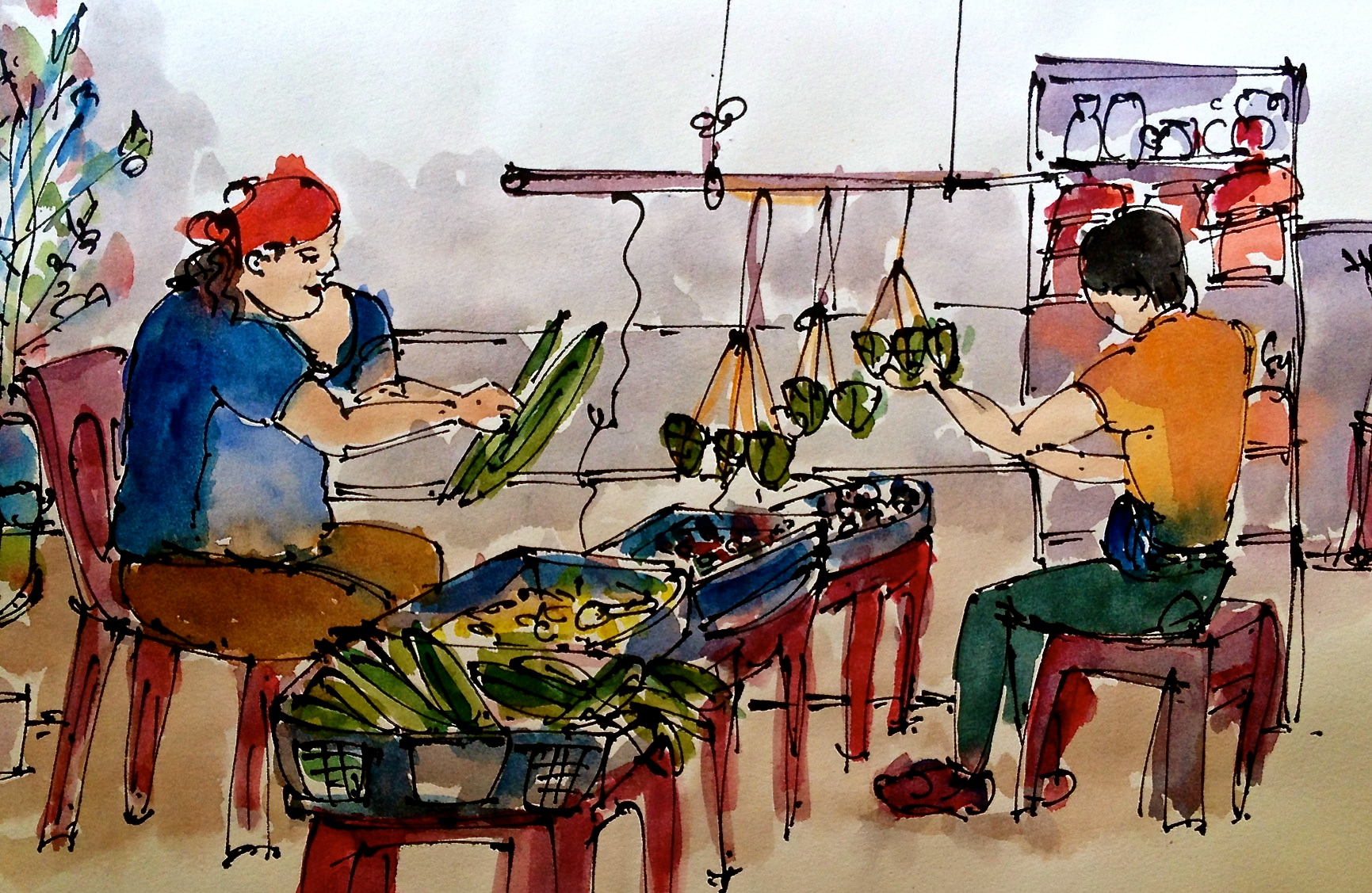 When I started picking his brain, Victor fed my curiosity with an enthralling tour of the temple and a crash course on Taosim and spirit mediums such as Ah Heng (see my sketch above) who are consuted on a regular basis by devotees to cure their ailments. The only thing that distracted me from our intense spiritual discussion was the smell of rice dumplings. Two volunteers had fixed themselves a make shift rice dumpling station on plastic chairs with a basket of steamed bamboo leaves, a tray each of rice, cooked mushrooms and pork.