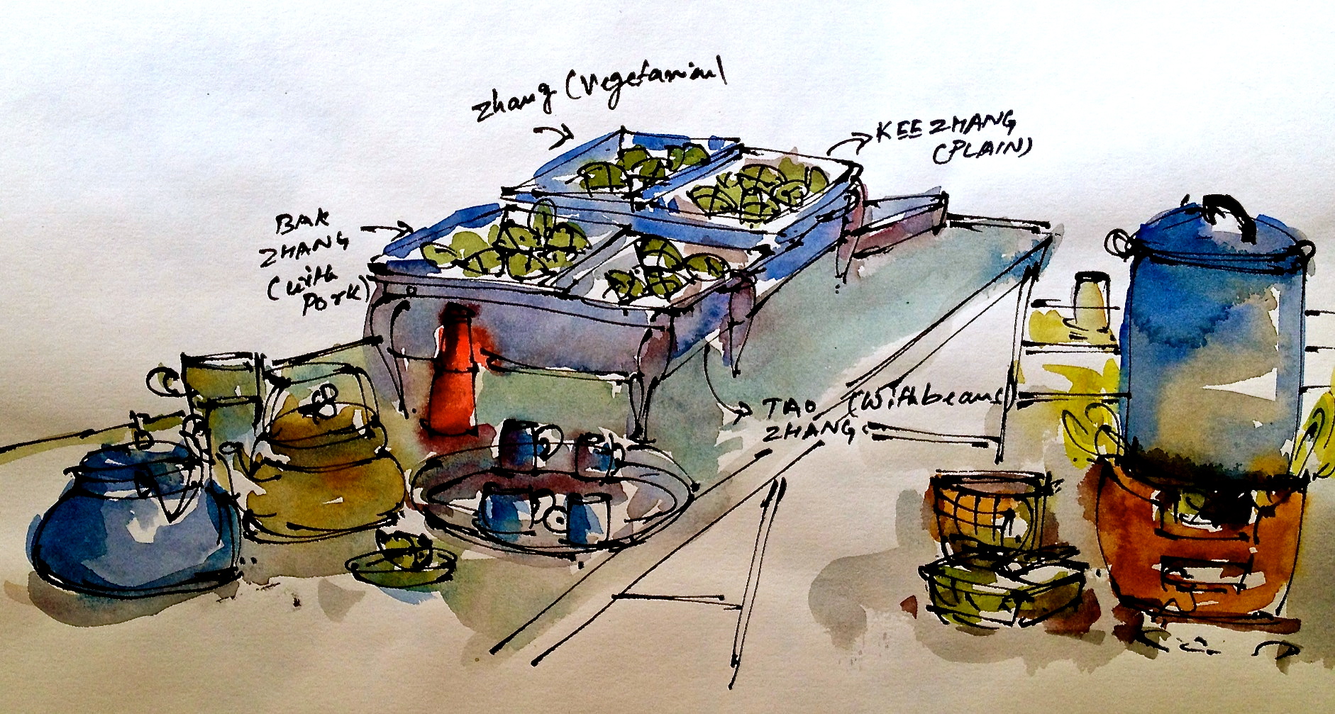 The rice dumplings were dropped into a large metal can of boiling water atop an open fire made out of wood and coal. “We can’t have such big pots in our homes, so my mother steams the dumplings in batches through the night, so we can have them in the morning on the festival day.” said Chao Zhu, a fellow urban sketcher, who was visiting the temple on a second consecutive year to celebrate Duanwu. I was curious to know if she could wrap rice dumplings nearly as good as her mother. “Gosh no! Unfortunately it’s becoming more and more obscure. I don’t think I can pass it down to the next generation.” Sadly there were too many heads nodding in agreement.