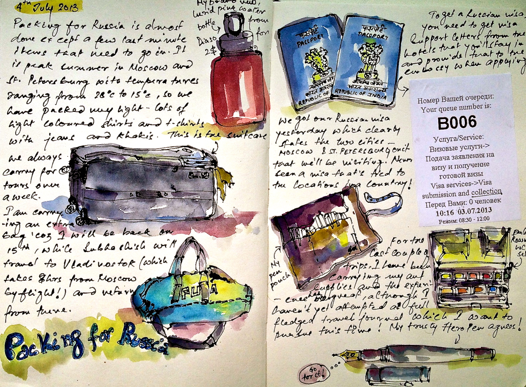 I am accompanying my husband on his official trip to Russia for 9 days and that up there will be my itinerary. The plan is, on the days he doesn’t work, we’ll explore the sights together and the days he works – which is most of the time – I will be on my own on the streets of Russia with a sketchbook and a map. Mixed feelings! On my own I’d amble along the streets without an itinerary, direction or purpose, just soaking up history and culture as it comes. But trying to record the sights and experiences in sketches, requires planning and a certain amount of alertness. The former is convenient, the latter is revelatory.