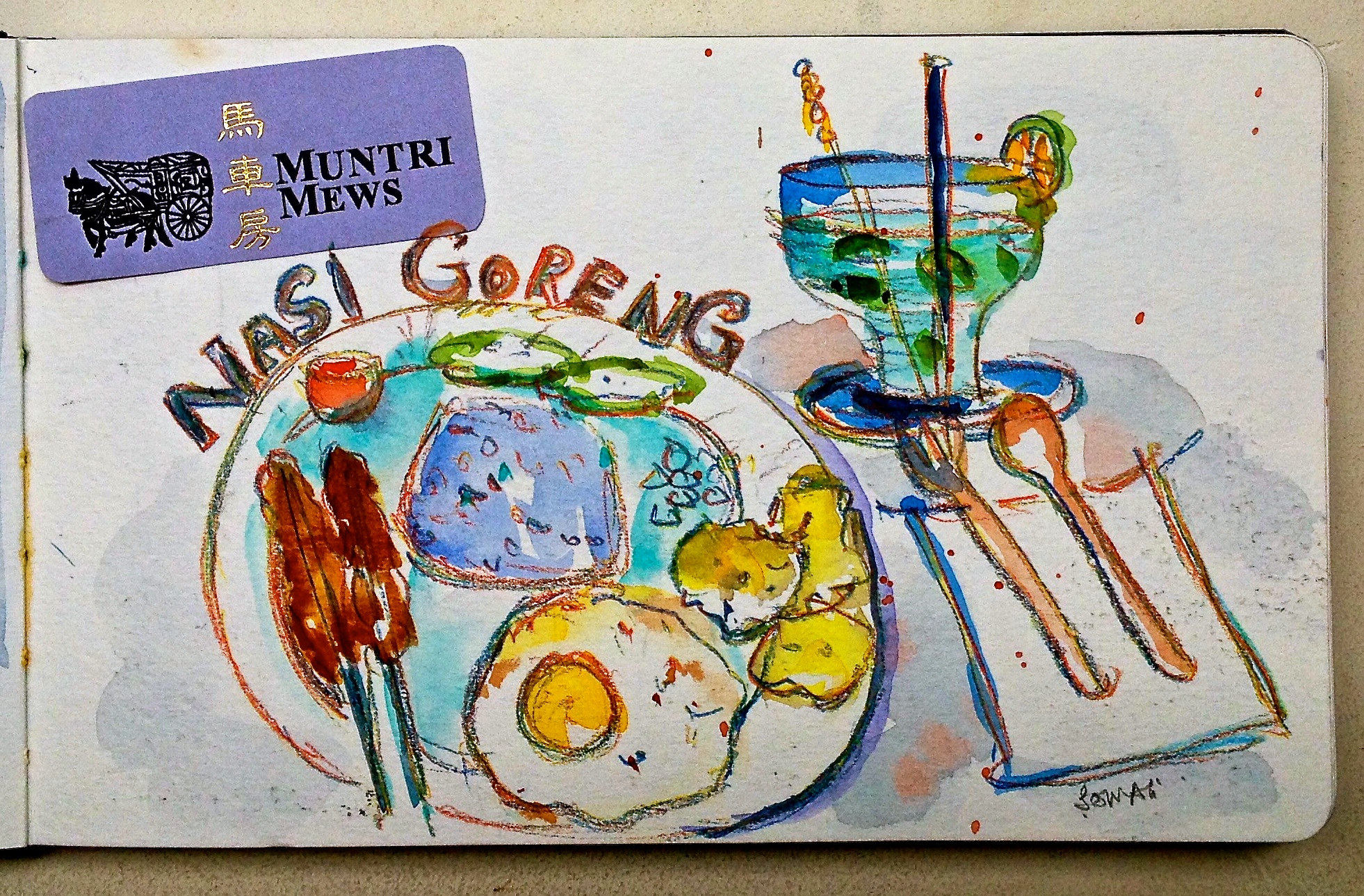 Impression 15 : Dinner at Muntri Cafe, on Muntri Street was rewarding after a day of sketching in Penang’s heat and humidity. We ditched the relaxing alfresco seating outlined by exhuberant green boughs for air-conditioning. Wiser choice perhaps, till it became dark, temperature dropped and those tiny tea candles on the tables outside were lit up. It was romantic, but we weren’t there. Then came the food. It wasn’t just warm and comforting but also delivered on taste and presentation. We snapped right back into the zone.