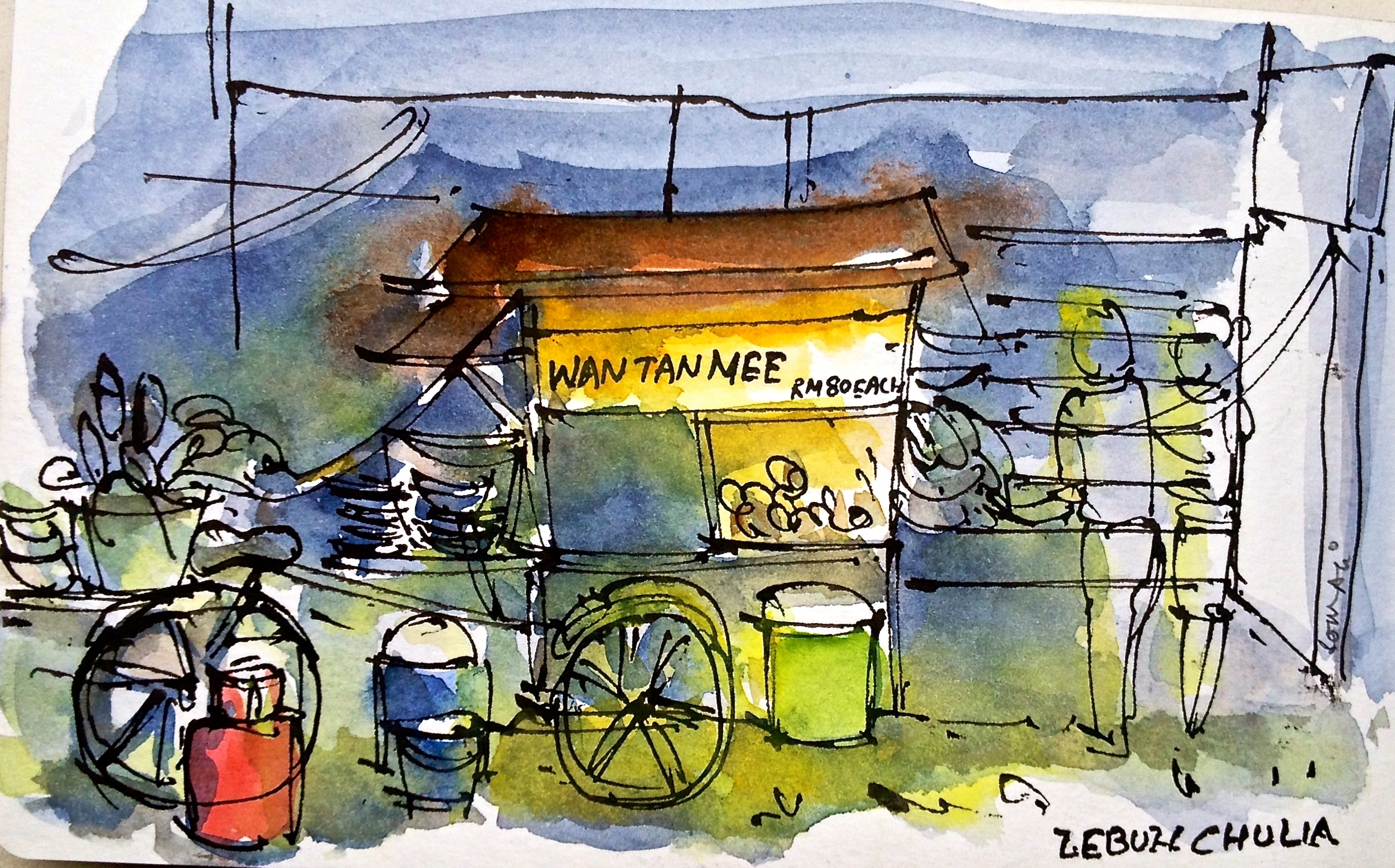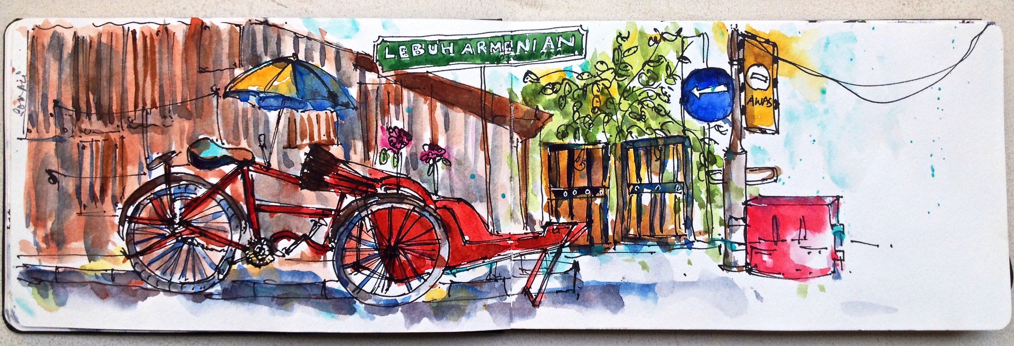 Impression 4 : When I saw this Red Trishaw parked on Armenian Street, I was compelled to sketch it, simply because of this  composition. I found a shady spot beside an Ice Kachang lady who initially tried to sell me her ware but later took the responsibility of shooing people away from my line of vision, including tourists. Halfway through the sketch, the red trishaw left, only to be replaced by another in few minutes but this was parked the opposite way. In an attempt to get it done, I was trying to laterally invert the vehicle in my mind and then draw it. When the trishaw driver, quietly lunching beside me got a whiff of my frustration, (I may have been muttering to myself), he got up and to my utter disbelief turned the heavy vehicle around just so I could finish my doodle and declined to take tourists for rides till I finished. When I thanked him, he just nodded. And the Ice Kachang lady dragged her son out of the house to show him my sketch. She seemed proud.