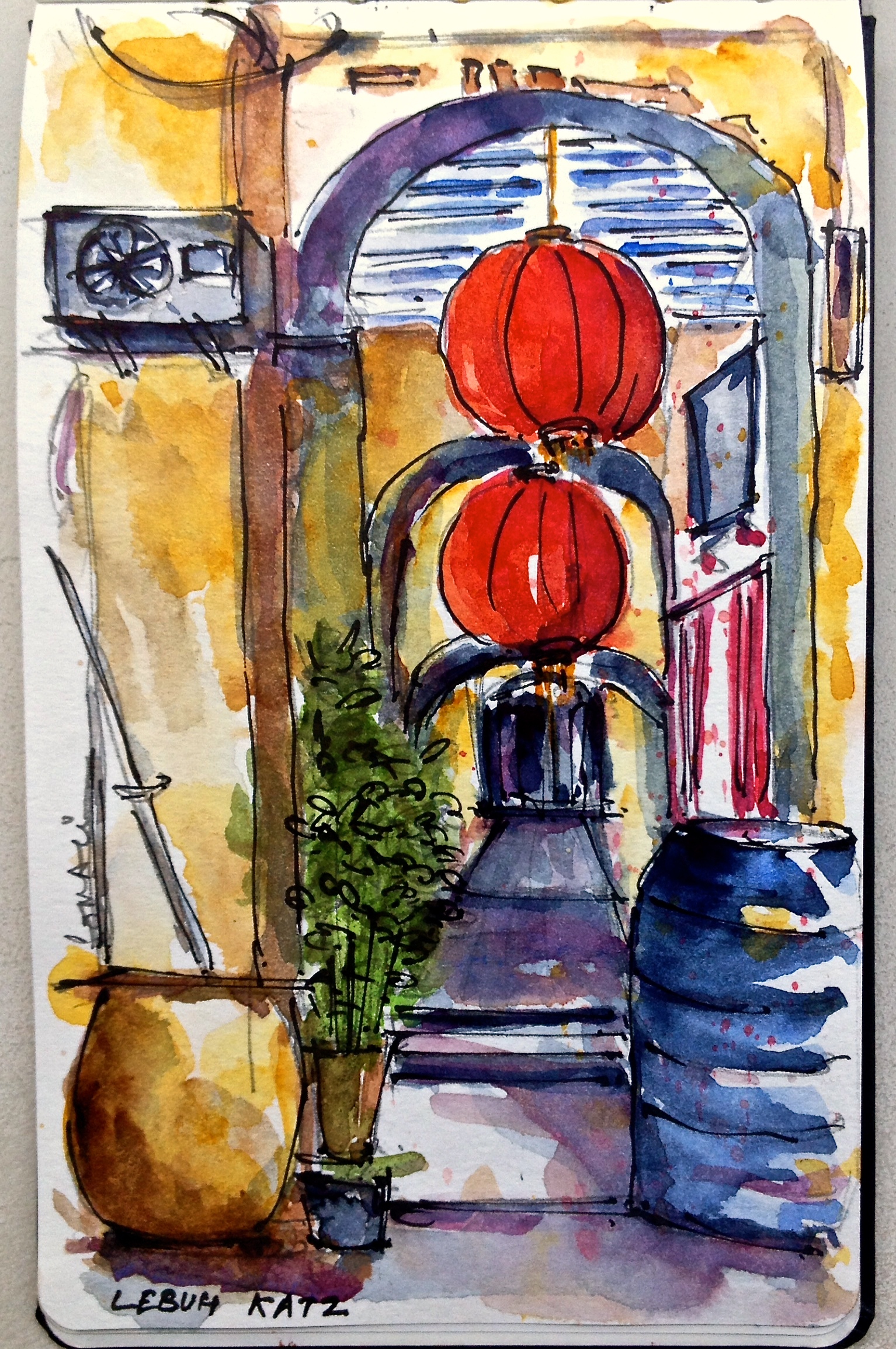 Impression 13 : If you’re sketching on the road, keep your privacy tucked away in the backpocket because you’ll attract people like flies to a candy. And your work of course is open to unsolicited criticism. On this single occasion of sketching   shophouses along Jalan Penang, I had an Indian migrant worker at my elbow the entire time, three families and a group of girls lingered and quietly took overhead shots. An elderly gentleman stopped by and said, ‘If this was up for judging , I would give you first prize”. I took off my oversized sunglasses and gave him a genuine smile. The smile was wiped off by the Korean tourist who requested for a photo of me with my sketch and kept me hanging while she fixed her lens and cleaned it before the shot.