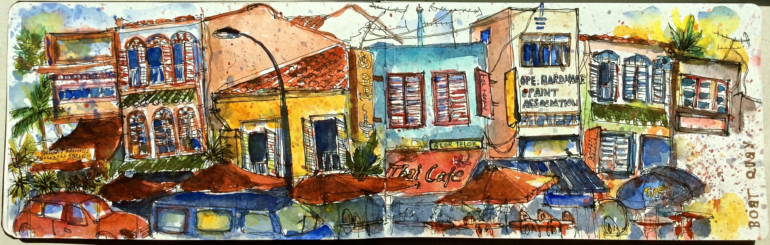 Impression 5 : I was sketching this aged beauty from a ruined torn down shophouse, right opposite when my husband said, there’s nothing indicative of ‘Love’ on Love Lane. Well, 19th century sailers and soldiers who made a beeline for the brothels lined up here would’ve differed. The amorous frolics of yesteryears have been replaced. Love Lane looked quiet, desolate and monochromatic that evening, except for a gaggle of tourists gathering around cafes chit-chatting about guesthouses, wi-fi, backpacking and travel. Perhaps somebody will talk about Love.