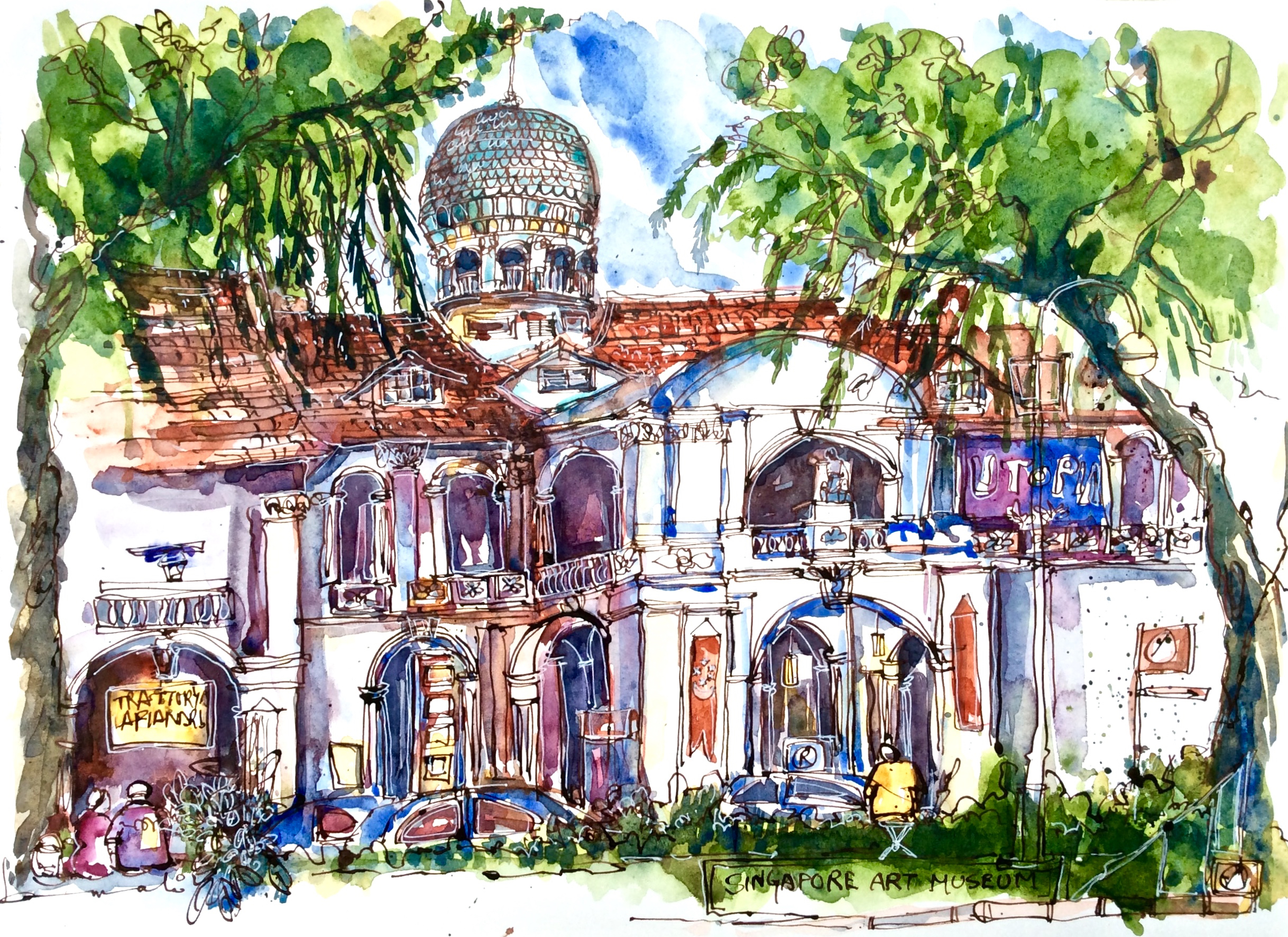 Bussorah Street, in Kampong Glam probably gets one of the highest footfalls in Singapore. Most photos and drawings of this street are of the front on view of the Sultan mosque. Here I tried to tell the story from a different angle by seeing differently. Sure there’s a hat tip to the mosque on the right, but the focus is on the sketchers in the foreground who form a part of the scene itself. This was drawn from the Kampong Glam Cafe.